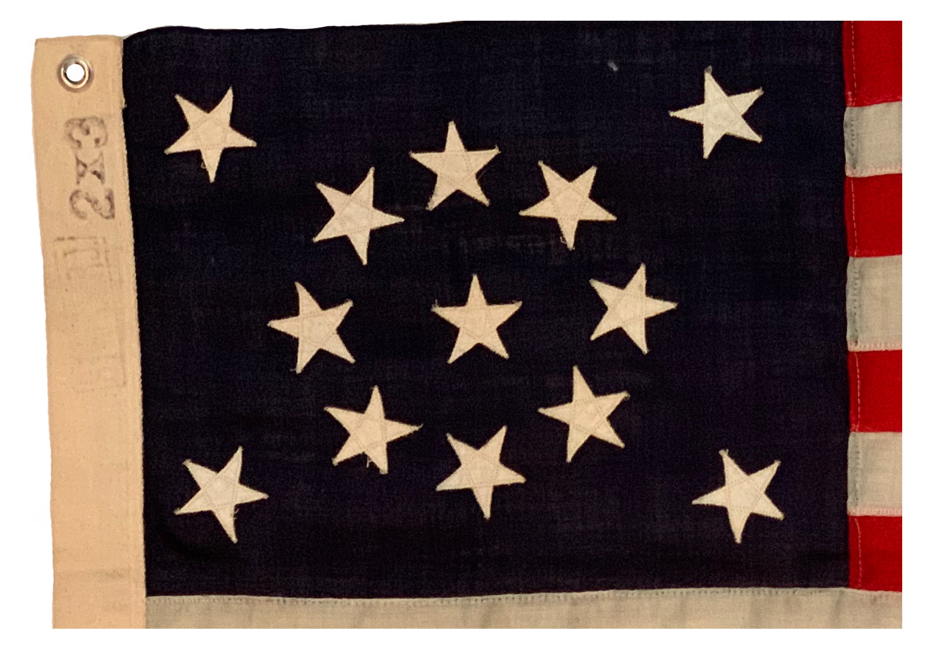 Flag is made of wool, colors are vibrant; 13 double appliquéd cotton stars attached to the canton with zigzag stitching in a medallion pattern; stripes attached with lock stitching; the hoist is made of cotton with a faded stamped rectangle encompassing the words 2x3 Standard., and contains 2 metal grommets.