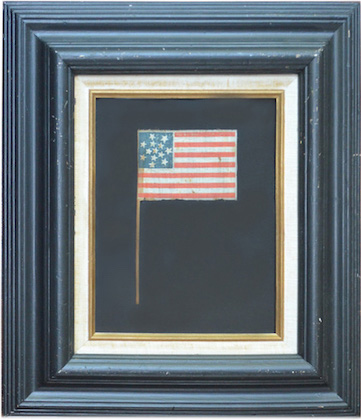 Frame size   17.25“H x 15.25 “L x 3 “ Thick, the flag presents itself beautifully while mounted on acid-free black cotton backing surrounded by an antique wooden frame painted black with a striking linen mat board and encased in UV protected glass.