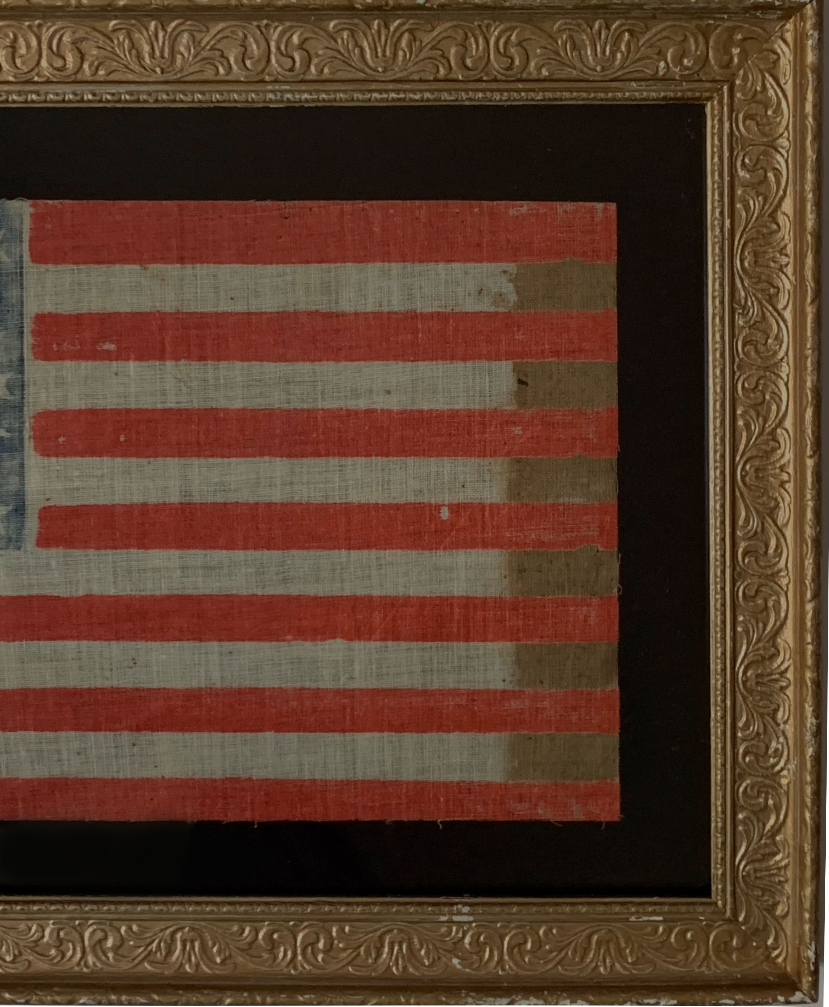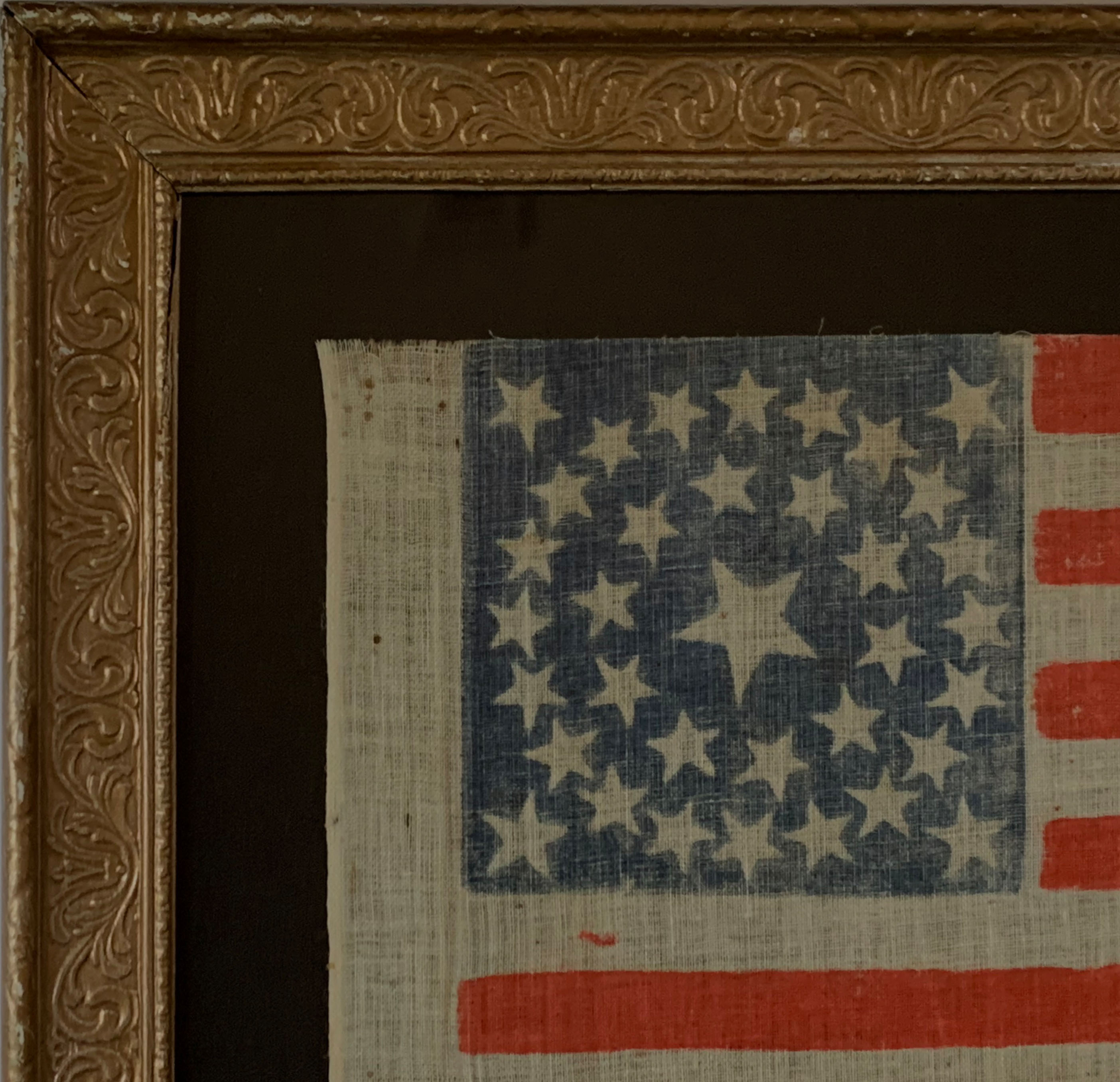 Offered is a 35 star American National Parade Flag printed in a medallion pattern on glazed cotton; Very good condition for the period, main staining located vertically on the fly, minor staining and foxing throughout