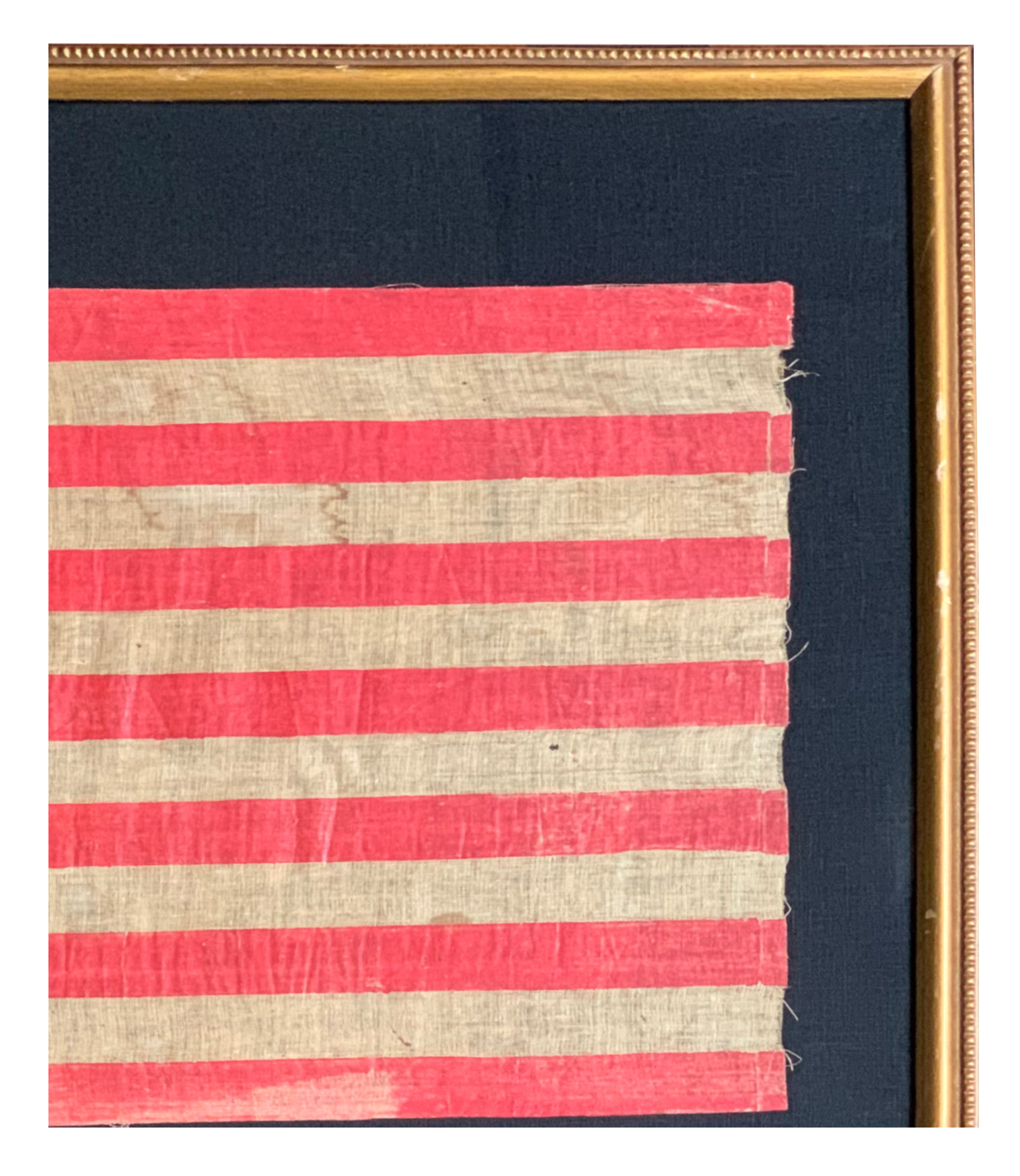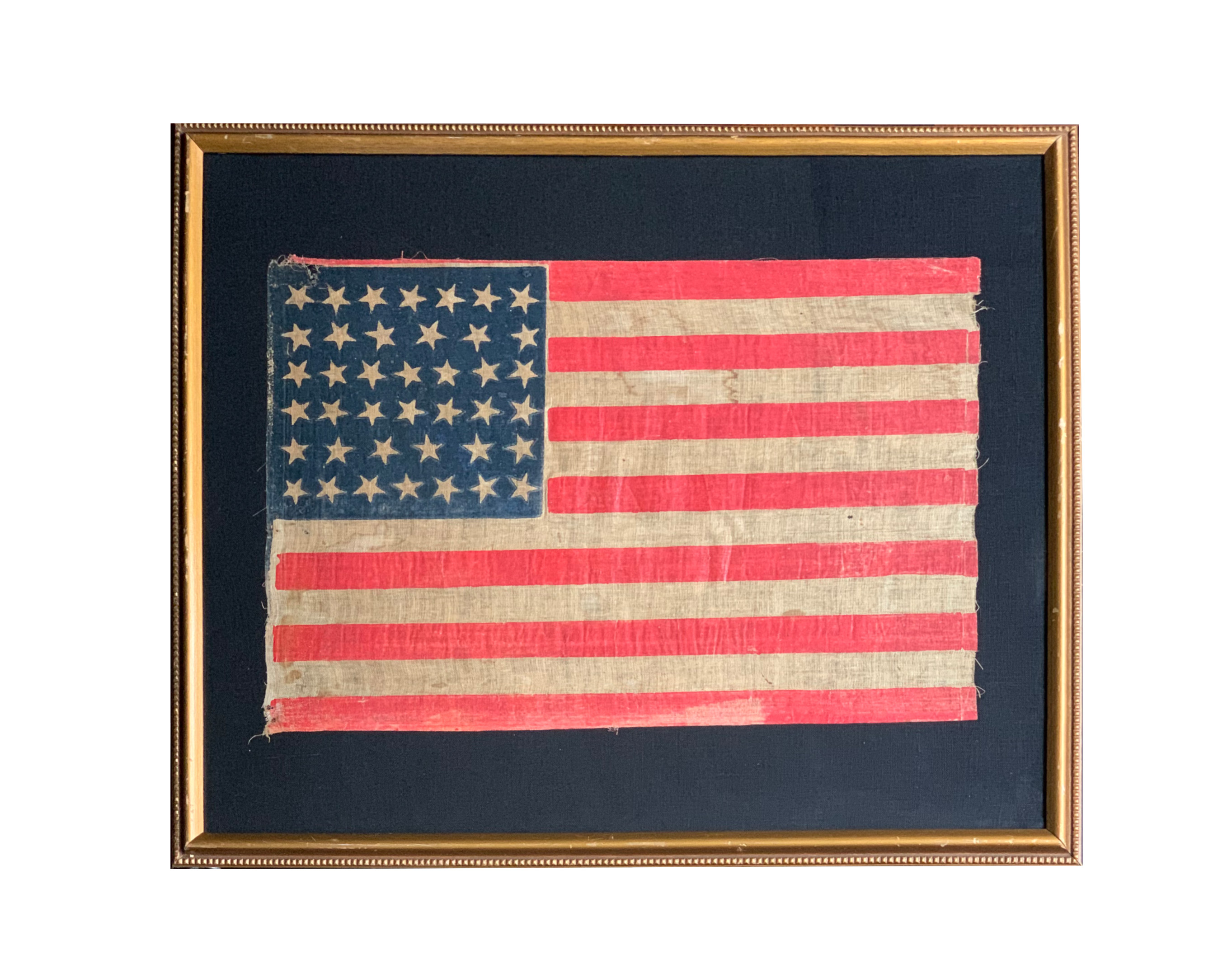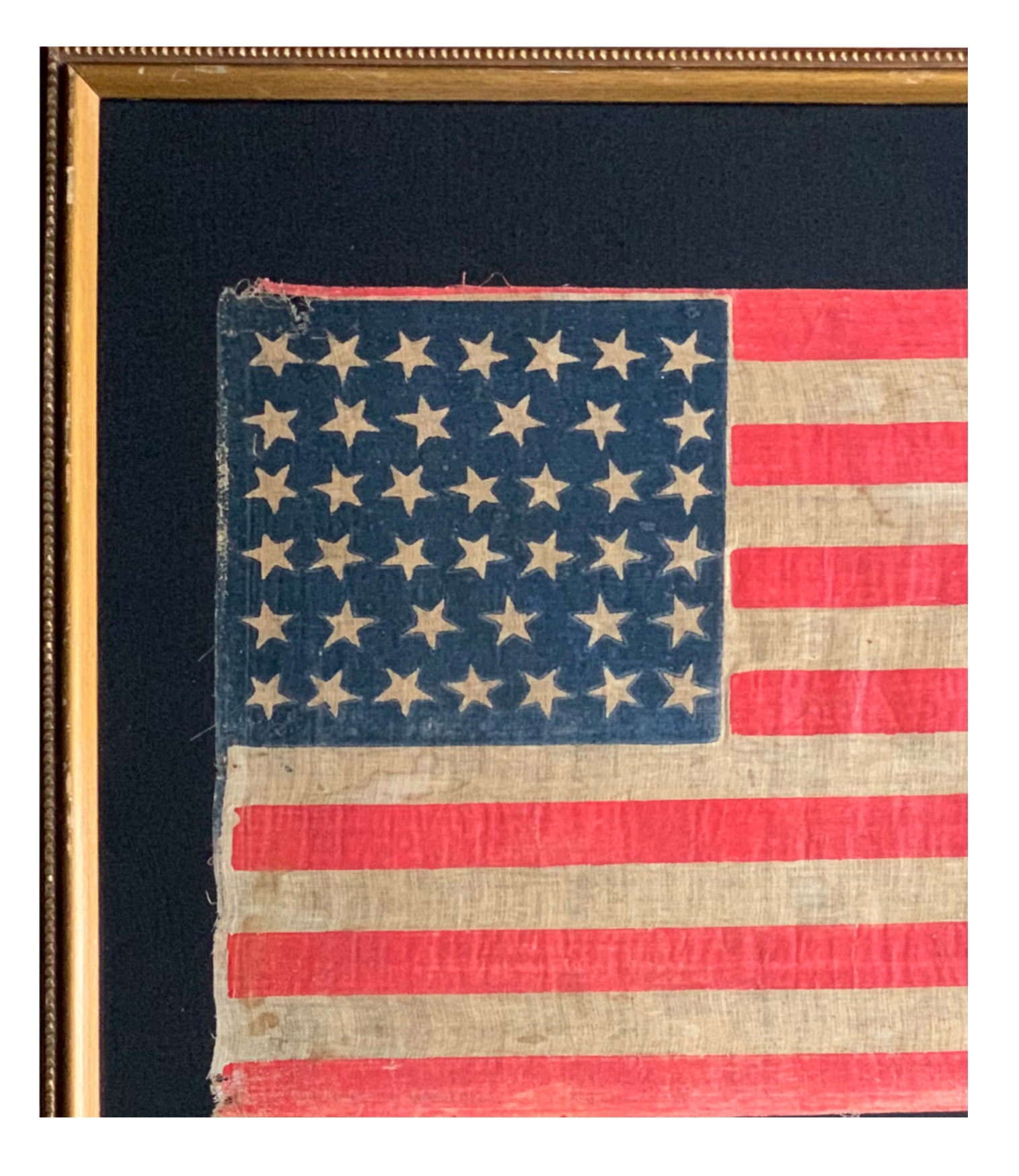 Forty-Star “unofficial” flag printed on muslin fabric, overall condition is good for use and period; stars arranged in a dancing pattern in a 7-6-7-7-6-7 configuration; canton is royal blue with slight fading throughout, fabric separation top left with a 1/2th “ fabric separation top and 2 -1/8th “ holes on the bottom likely from the original nails used to attach the staff to the flag, slight fraying along the left side of the flag where staff was attached; fly has fabric fray on the second white stripe, ¼” vertical fold visible on the right stripes; color loss on bottom red stripe; minor stain throughout; vintage frame made of hardwood painted black and aged gold