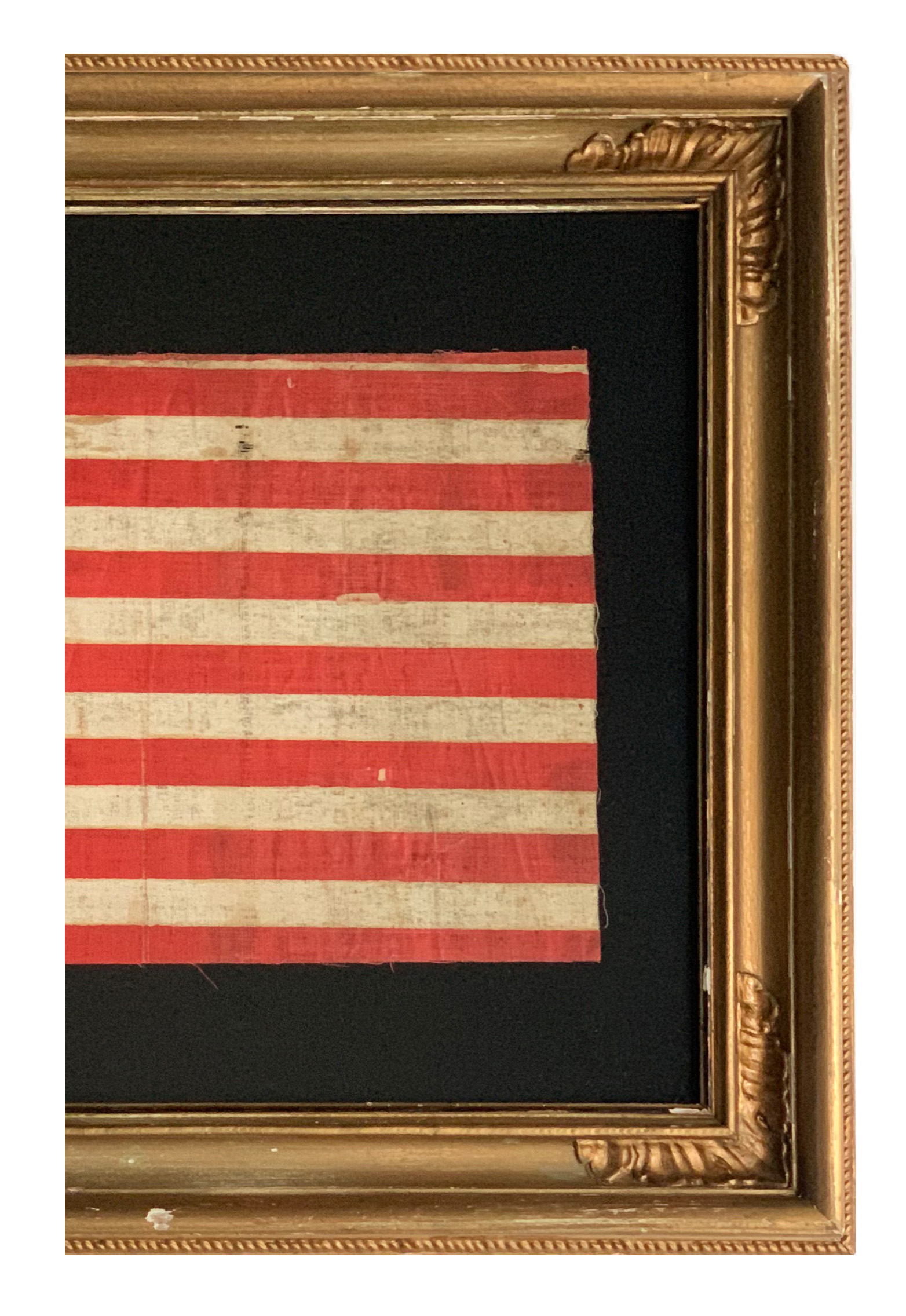 The flag is made of glazed cotton, it has areas of material loss and creases, edges have slight fraying, colors are aged but vibrant. The flag is pressure mounted on pre-washed black cotton over an acid-free backer board; the beautiful antique Gesso wood frame is painted in a gilded gold finish.