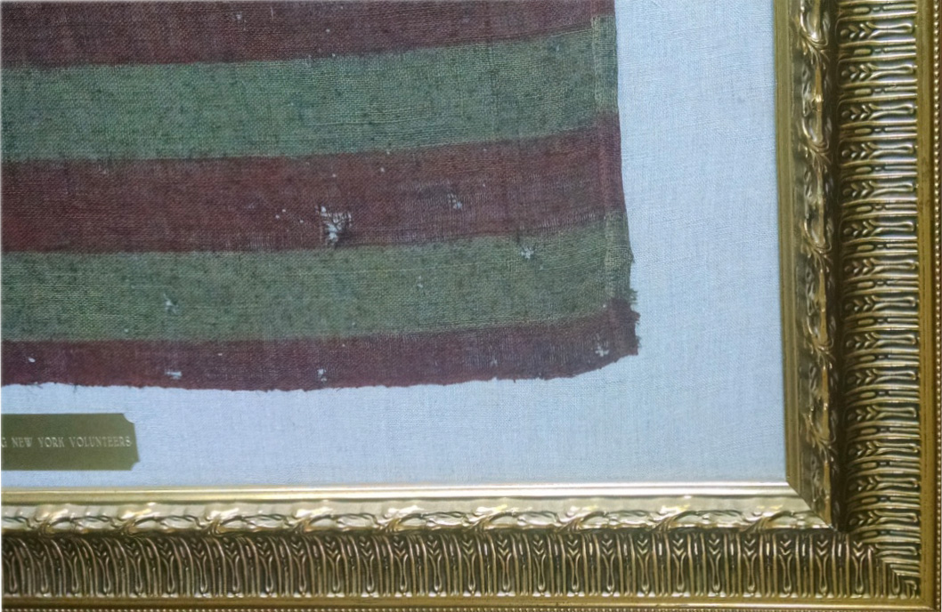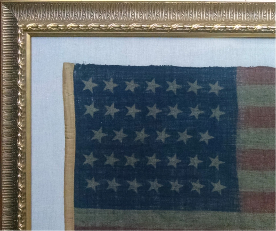 Flag size 4 ¼ ”x 7”, made of cotton fabric with a beautiful aged appearance that gives the flag an historical aura. It is in very good condition with no visible holes or tears but does have slight staining throughout. The Forty-Eight Stars are printed in a strategically arranged pattern, which would have easily allowed a manufacturer the space for additional stars to be added as new states joined the Union in the future. The original 7 ¾ ” wooden Staff remains attached however it appears the bottom may have had a small portion broken off. The flag is pressure mounted on a pre-washed 100% black linen fabric and it is all showcased by a handsome 13”x16”hard wood frame, likely cherrywood.