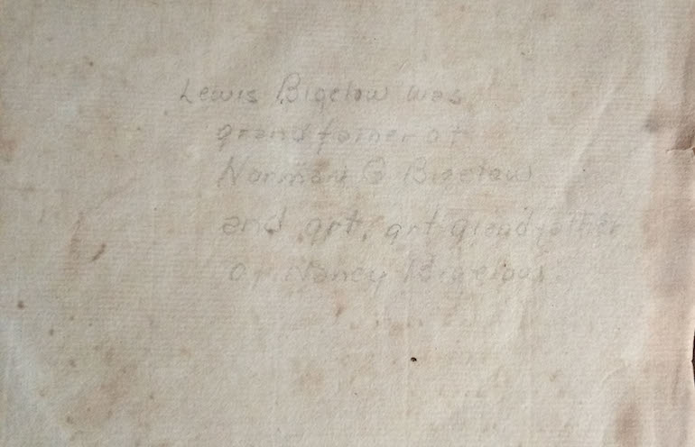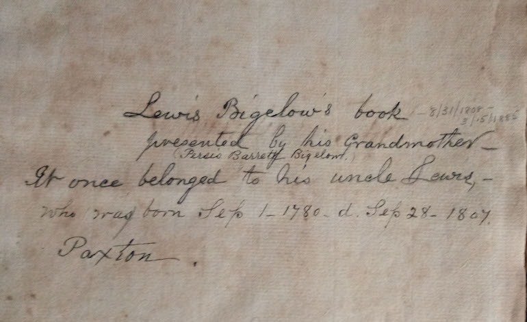 Louis Bigalow's cyphering book 8/13/1808 to 3/15/1885 presented by his grandfather, Persio Bartlett Bigalow, It once belonged to his uncle Lewis who was born September 1, 1780, died September 28, 1807 Paxton.