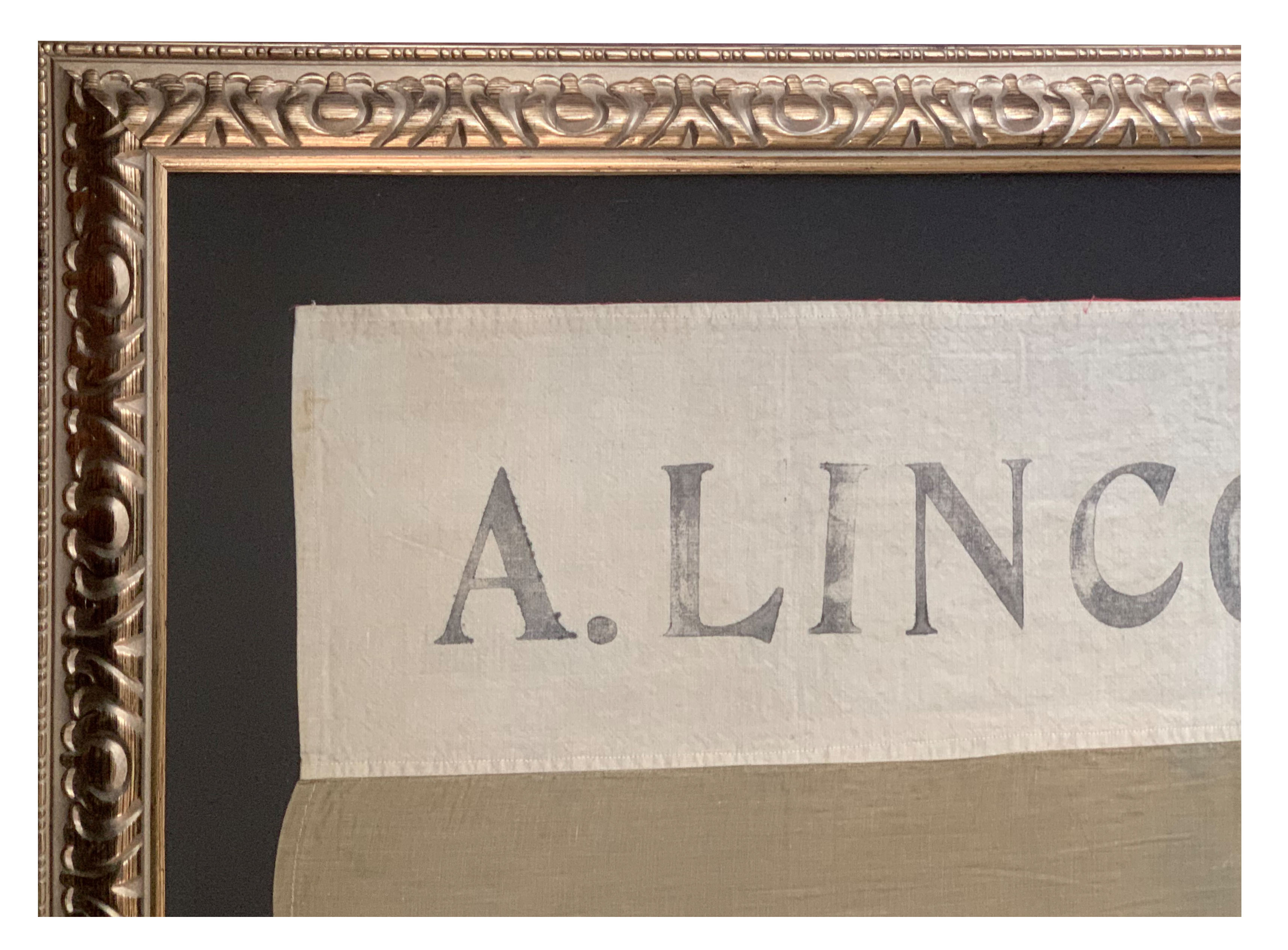 Stunning representation of a 19th Century Lincoln banner printed with black-stenciled letters “A. LINCOLN for PRES 1864”. Examination of this Banner reveals a blend of cotton and flax threads commonly found in eighteenth and early nineteenth- century fabrics. We are unable to confirm this banner was made at the time of the election as the possibility exists it may have been made post election to commemorate President Abraham Lincoln’s re-election victory.