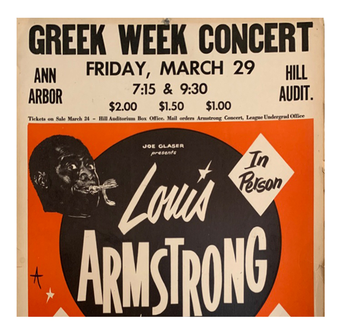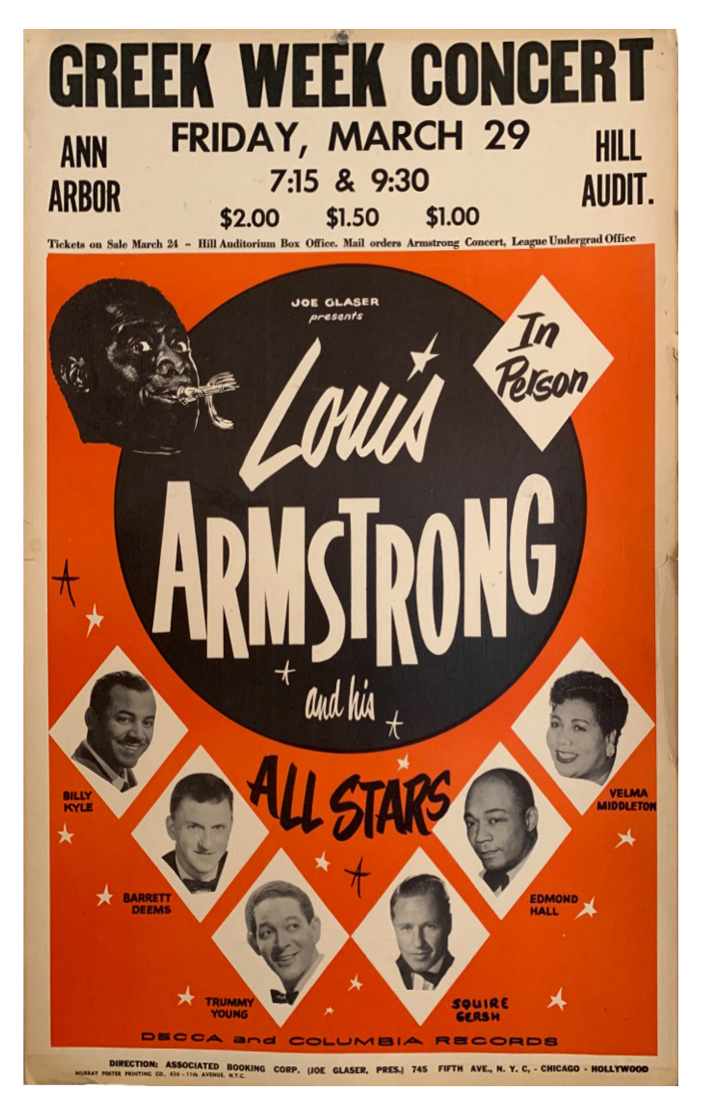 Louis Armstrong and his “All Stars” Poster printed on card stock advertising Greek Week Concert for a show on Friday, March 29 in Hill Auditorium Ann Arbor Michigan.