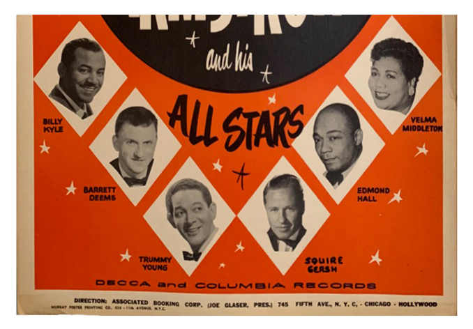 The poster printed by Murray Poster Printing Co., NYC featured six blank diamonds allowing for photographs of different members of Armstrong’s Band to be inserted for specific shows as the line-up often changed from venue to venue.