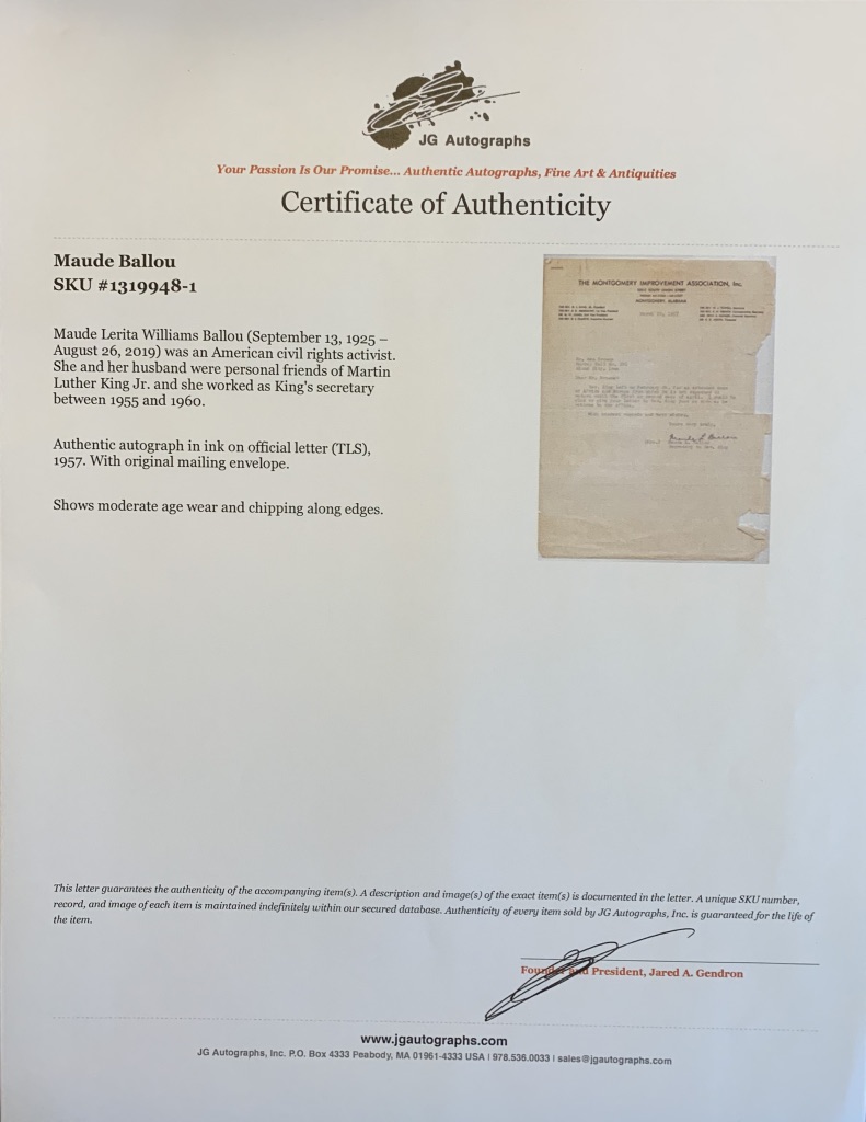 Offering a framed letter dated March 20, 1957 addressed to Ken Browne, a veteran who served in the military in Italy during WWII, received from the office of The President of The Montgomery Improvement Association Inc., The Reverend Martin Luther King Jr., signed on his behalf by his personal secretary Maude L. Ballou.