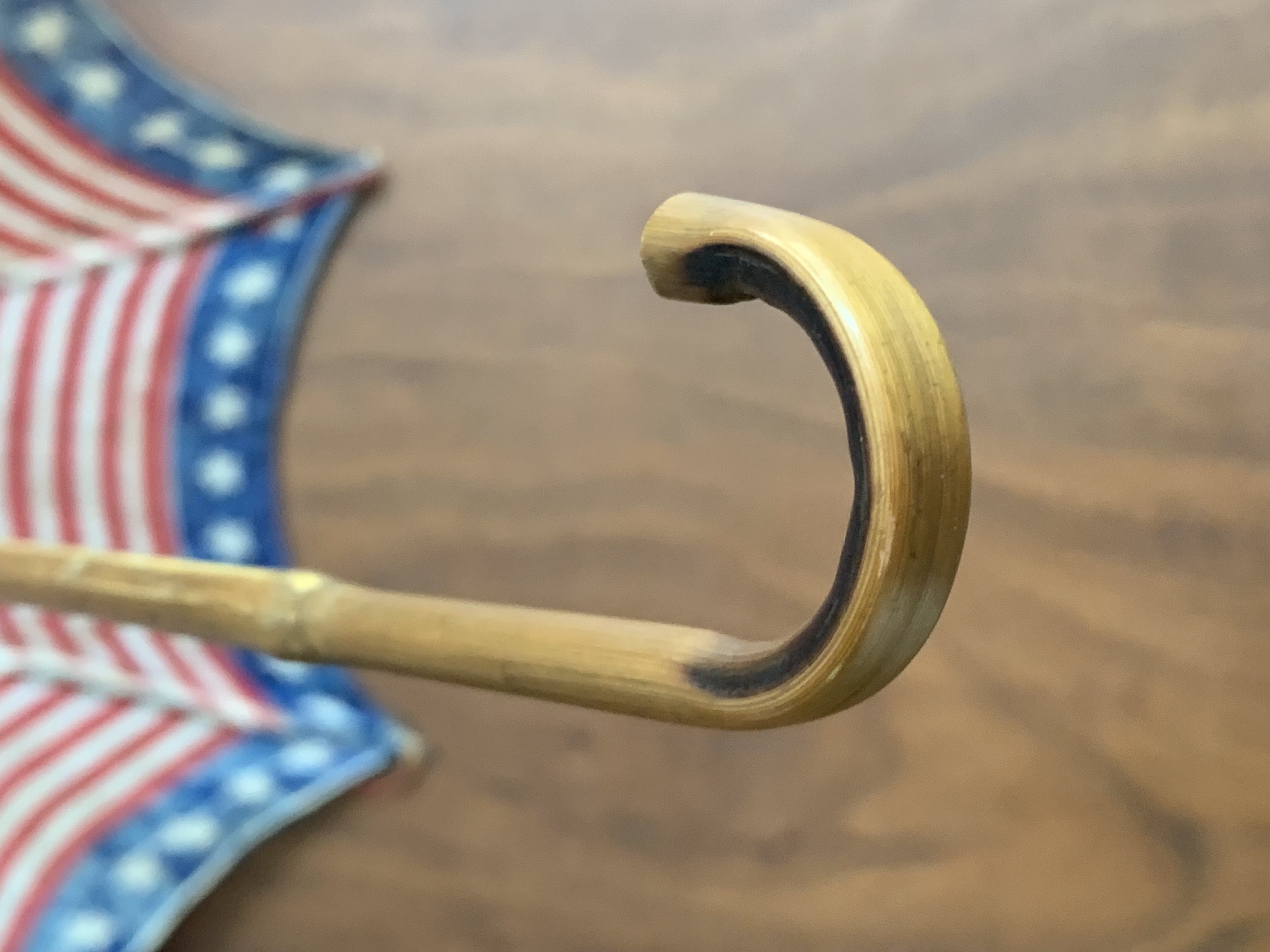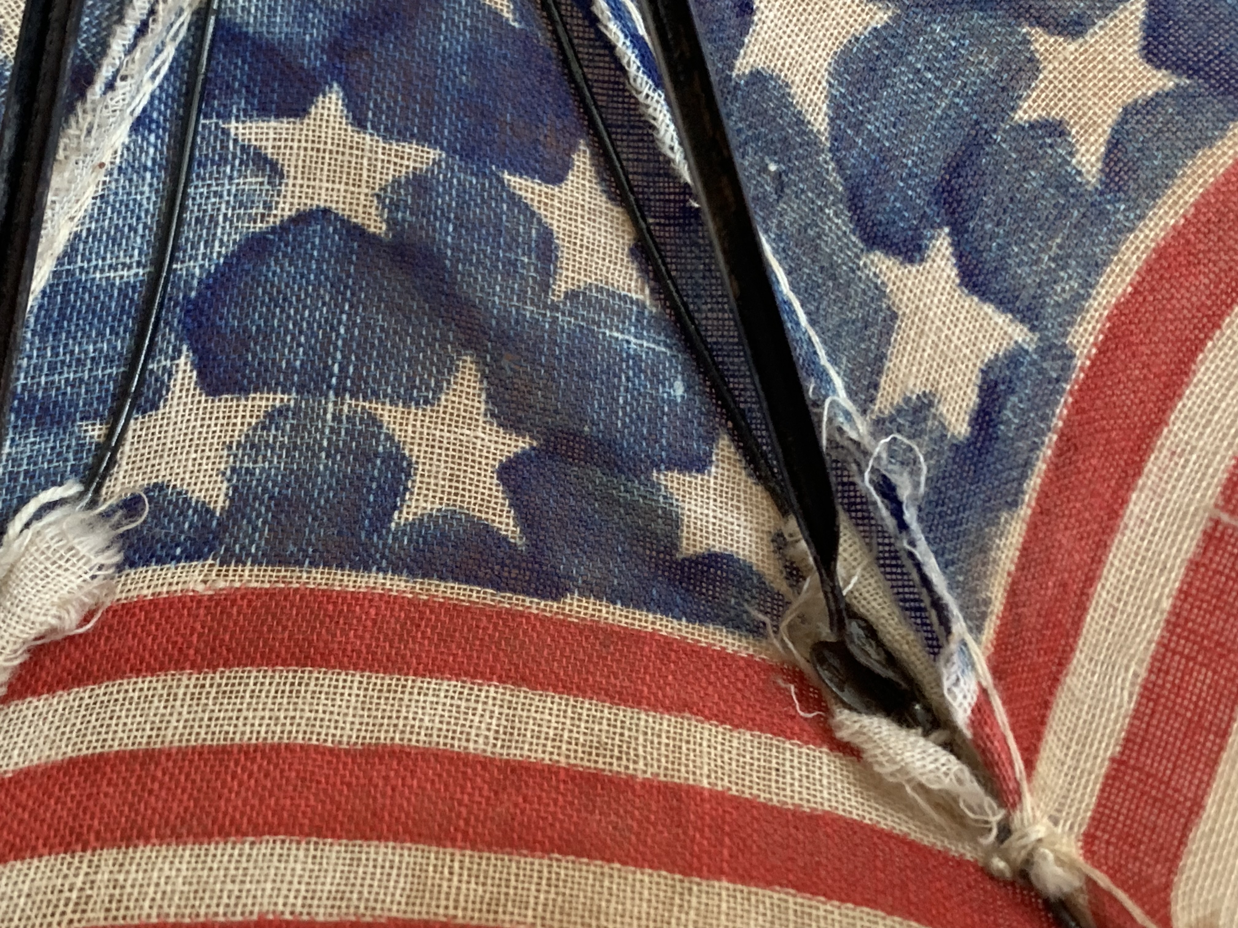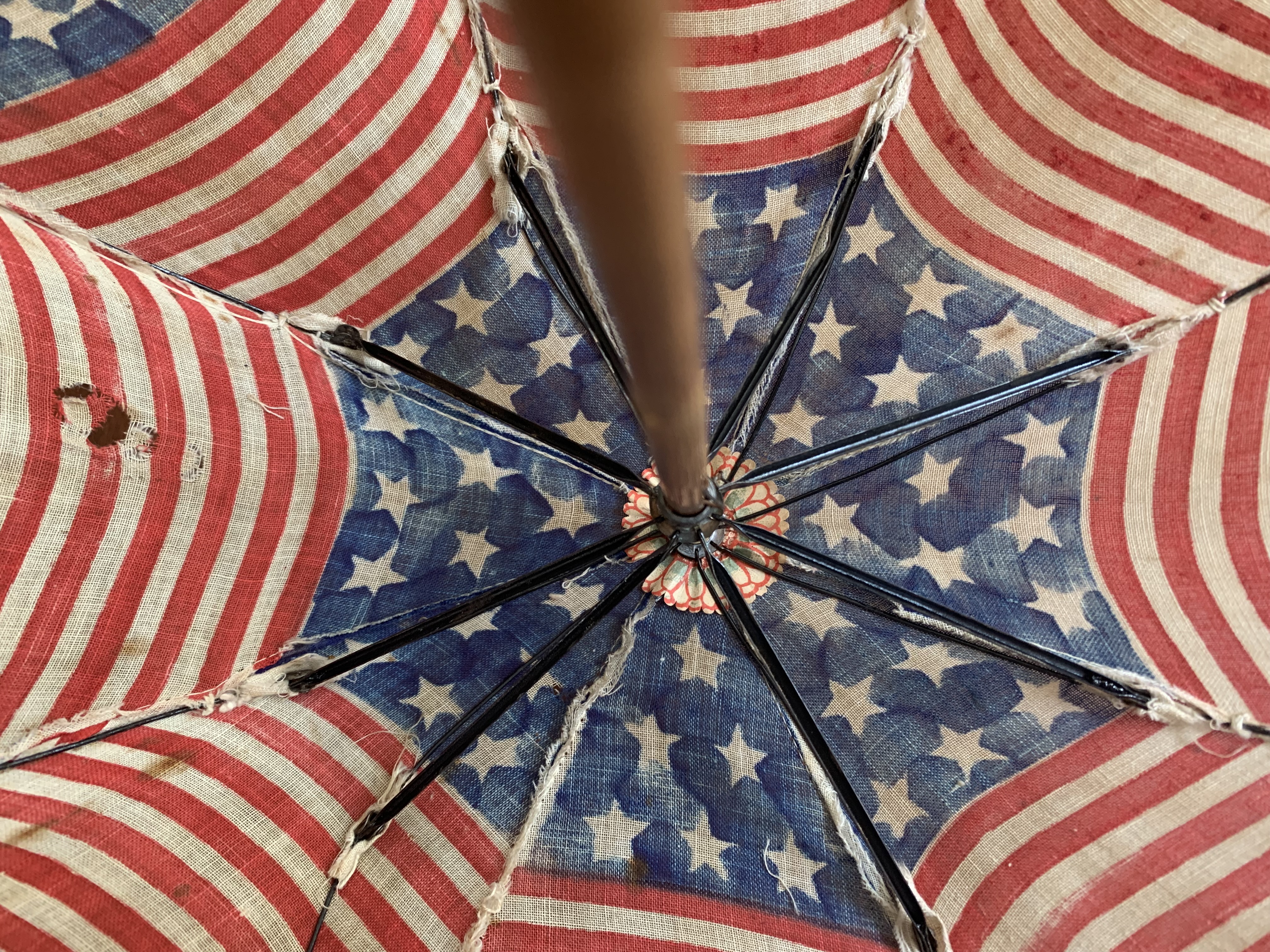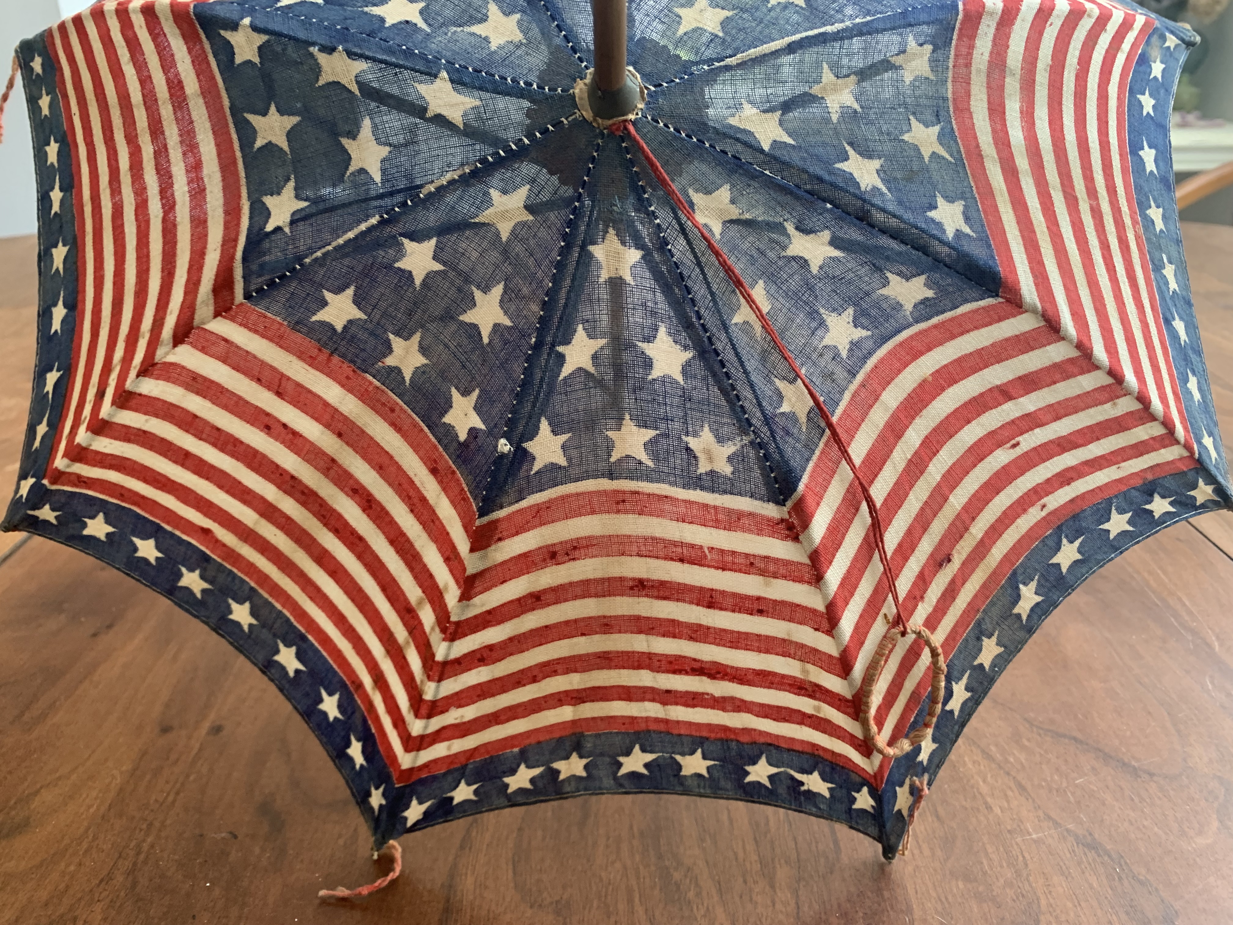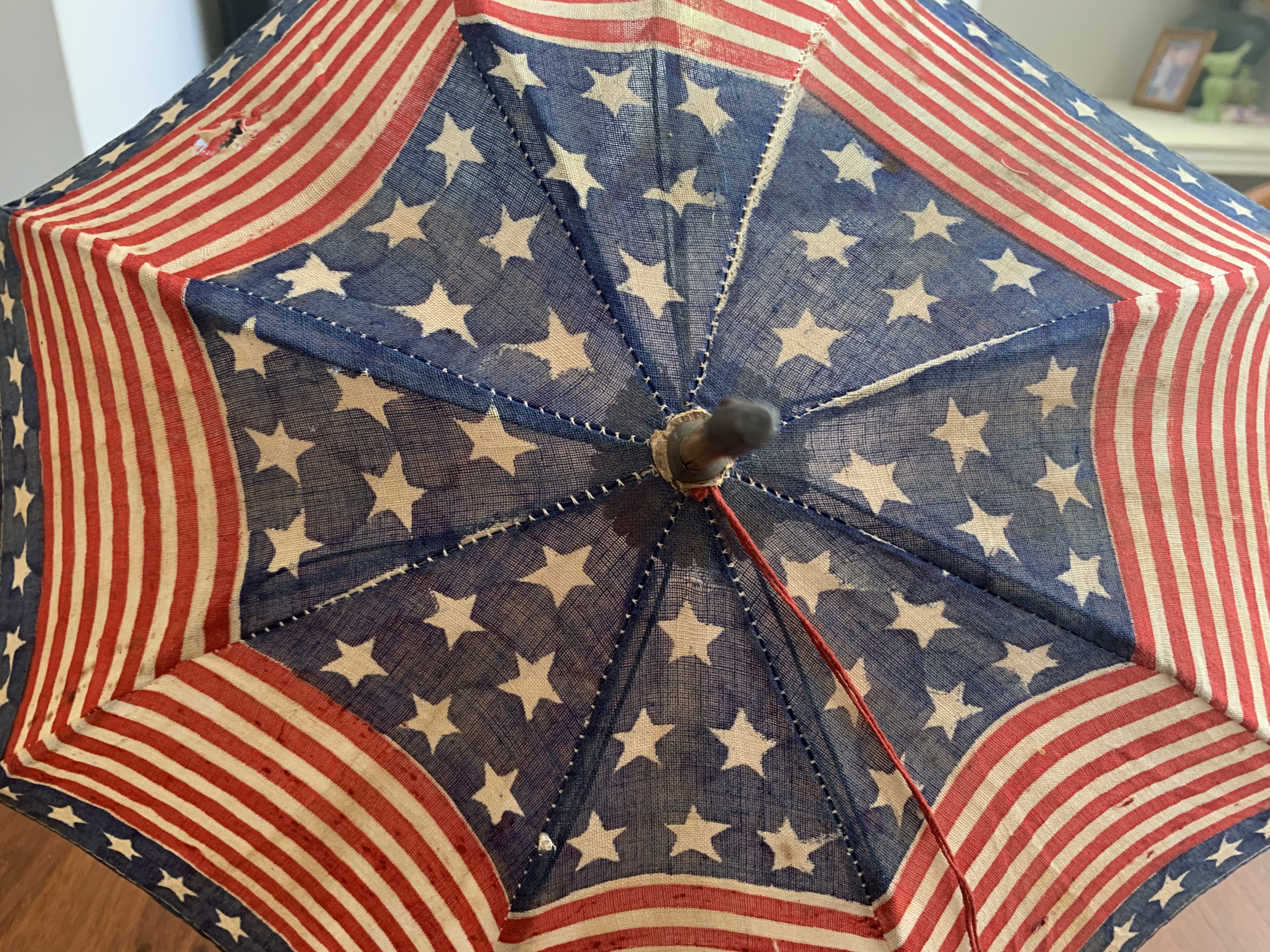 There is a small hole in the cloth as shown in image #1, missing nut connecting one rib support as shown in image #7. Overall the parasol is in great condition given its age. United States 48 star flag; 13 stars and stripes.